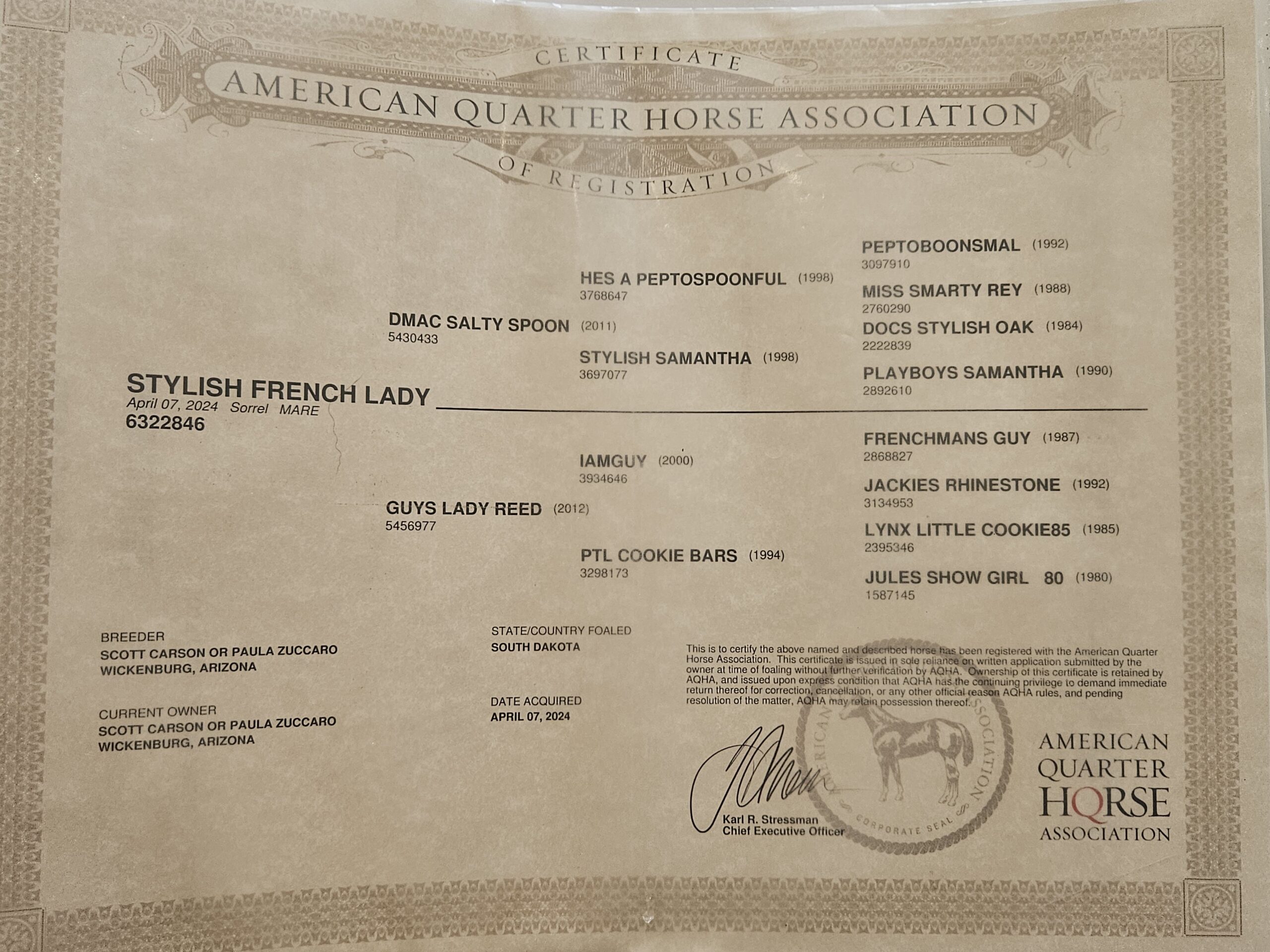 This little filly is bred for the barrels or will make an outstanding all-around horse for roping or cutting. She has a timid personality but is very sweet. Stylish French Lady will stand over 15 hands. The earnings for Frenchmans Guy offspring total more than 10 million from 915 performers. The sire, DMAC Salty Spoon is a son of He’s a Peptospoonful, who was a top sire of the cutting horse world. His offspring’s earnings total 3.4 million. DMAC Salty Spoon has a gentle disposition. DMAC Salty Spoon stands at Frink Quarter Horses in Wall, SD.