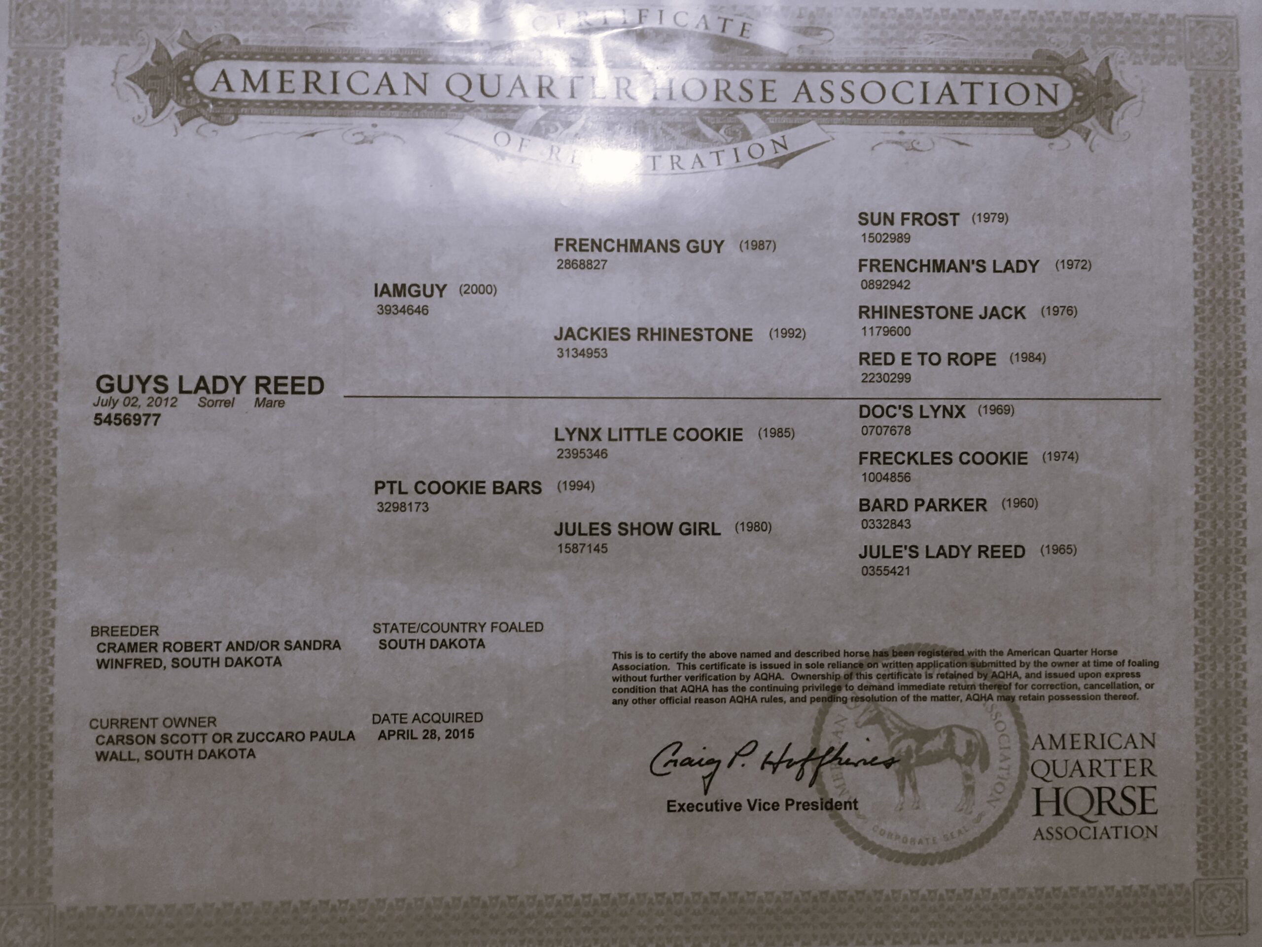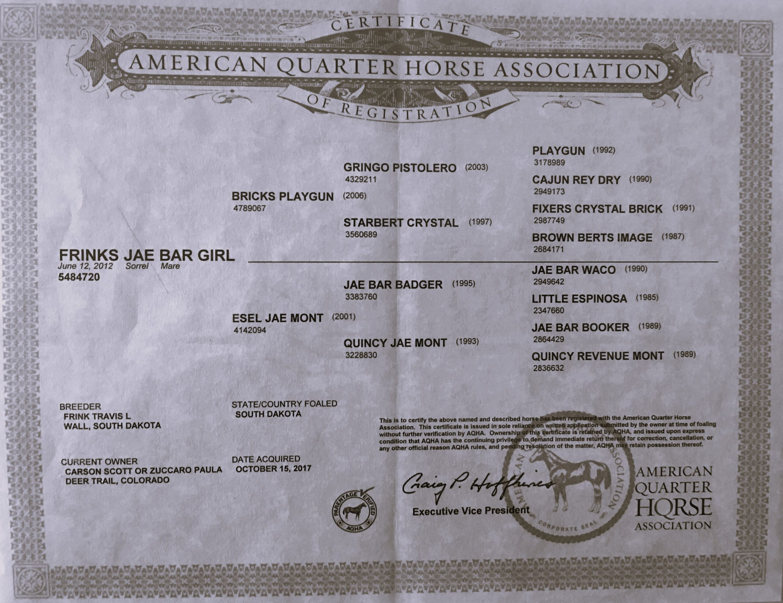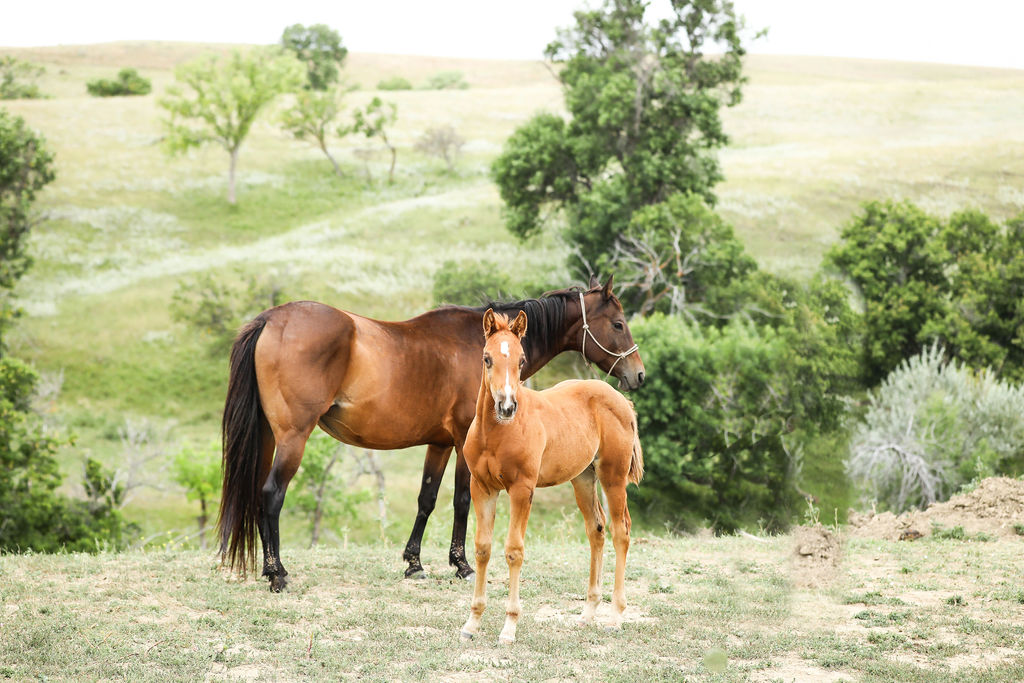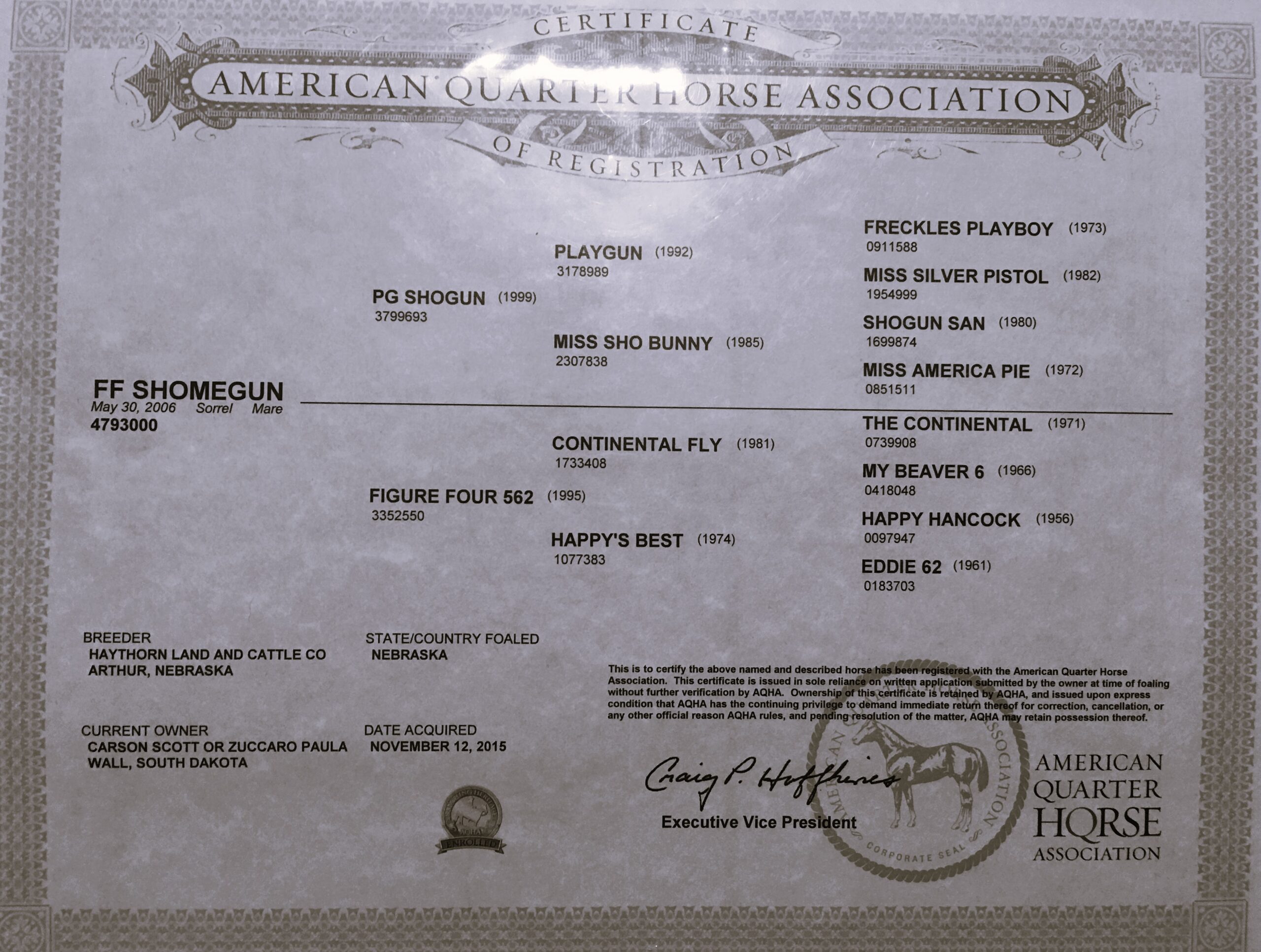 Sho Me is the daughter of PG Shogun, and granddaughter of Playgun. She comes from the Haythorn Land and Cattle Company in Nebraska. Show Me is a very big and stout mare and all her foals take on her size. She is independent but a cautious mare as the last one to receive a treat.