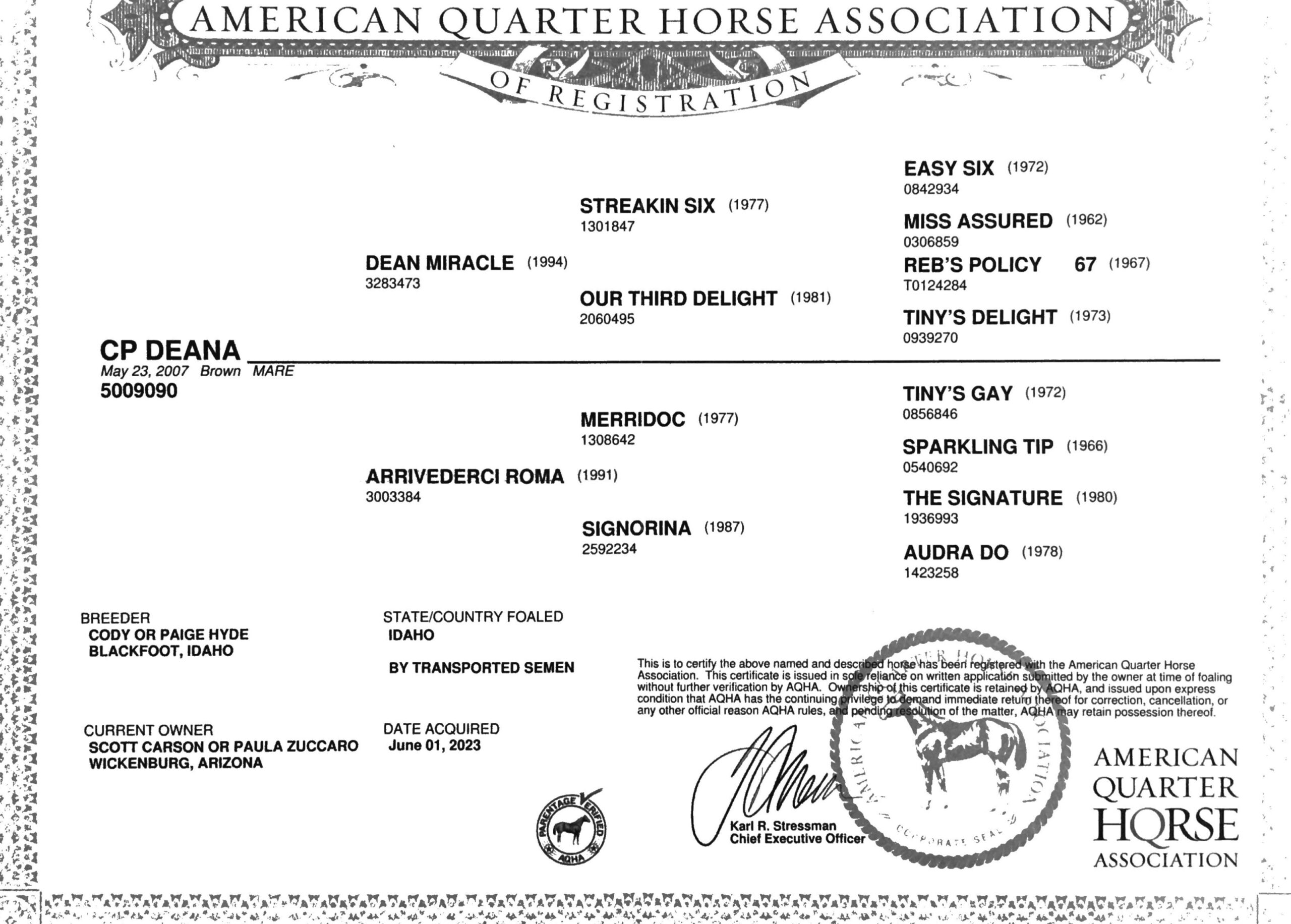 Deana is our new Streakin Six. She comes from the thoroughbred bloodlines of Tiny’s Gay and Tiny’s Delight. Deana is gentle and very smart. She foaled Prince in 2023 and he has been so much fun to handle and in your pocket. Deana has been bred to KT Just Fly for 2025.